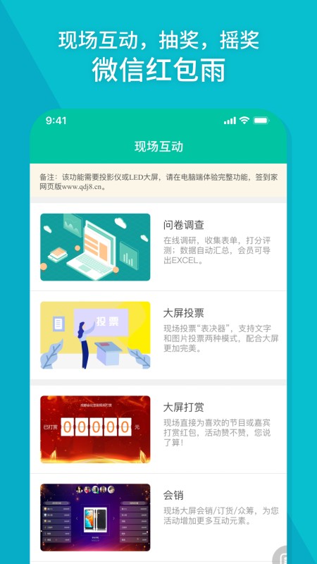 支持现场抽取、派奖、签到墙等,利于策划现场互动。