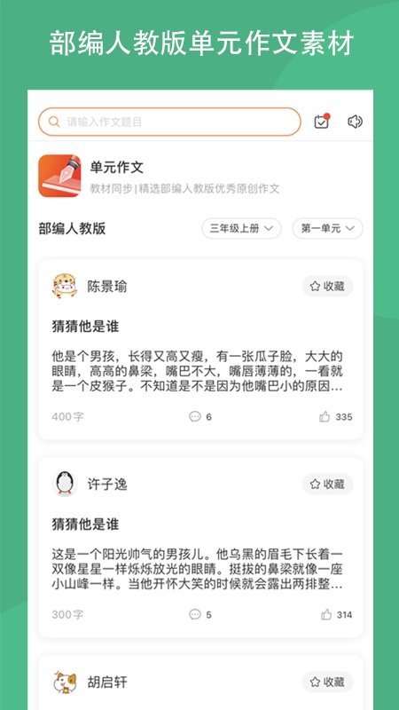 作文吧,10000多名优秀语文作文名师指导协作,给学生们提供一个写作文、品作文、评作文、改作文、发表作文的优秀作文平台。app内涵盖人教版、苏教版小学、初中、高中各年级同步单元作文、话题作文、主题作文、英语作文、看图写话作文、还有海量一看就能用的作文素材,优秀原创作文范文应有尽有。