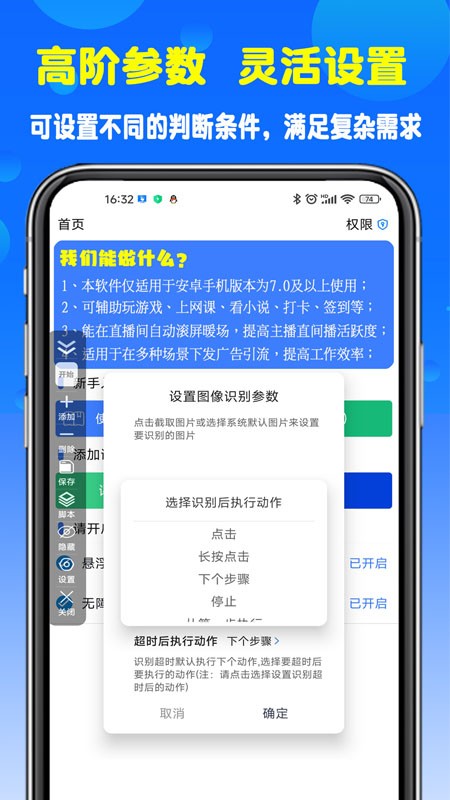 该软件是一款安卓手机自动点击器,可代替双手在屏幕执行繁琐操作。它具备丰富功能,支持点击、滑动、返回、输入文字、识别文字、识别图片、截图等十余种操作。用户能自由组合添加脚本,自定义设置运行次数和速度。还支持在不同场景发送文字,可重复发送多样化内容,精准识别界面上不同样式的文字以及屏幕上的指定小图。截图时可隐藏功能框,保证界面干净完整。此外,软件支持储存和加载自定义脚本,支持定时启动、定时停止。