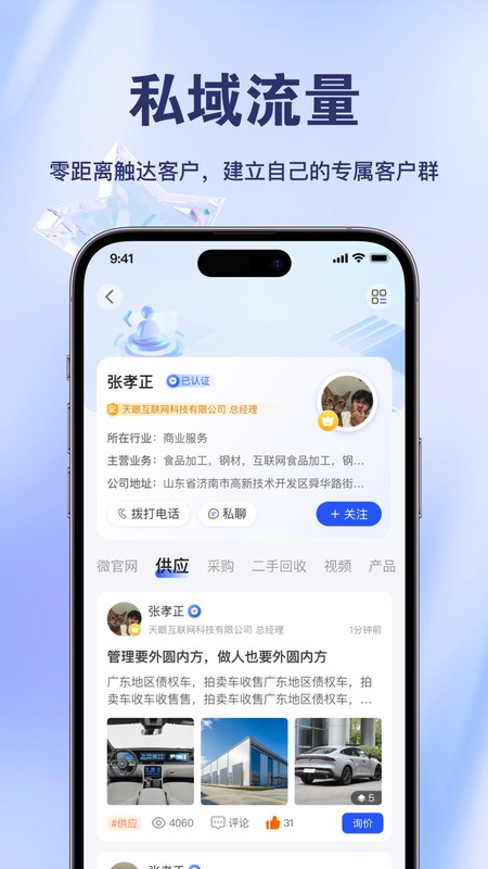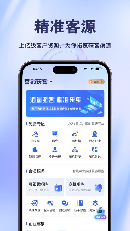 商讯通APP具备拓客、营销、推广、引流等功能。其客源采集系统拥有全国3亿企业资源总汇,可按行业类别轻松锁定目标客户,精准获取线上客源,低成本挖掘企业客户线索。智能营销系统能通过AI自动化营销筛选意向客户,实现目标客户精细化管理,帮助企业提高销售效率,推动成交转化。商机推广系统可对发布的供求商机、产品类型和采购订单进行精确推广,根据行业标签智能匹配优质客户,实现海量商机线上询盘合作。