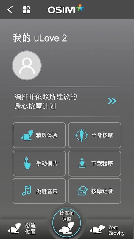 使用智能设备和移动应用技术打造的uLove 2 APP,与OSIM uLove 2按摩椅连接配对,让您轻易控制按摩椅功能。操控按摩调整,并同时下载新的按摩程序与音乐。