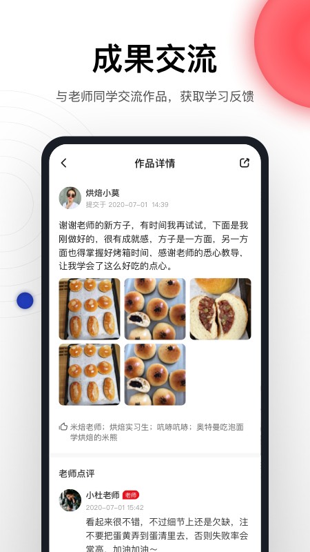 提供全天在线答疑服务,采用视频课程 + 班主任 + 助教的陪伴式教学模式。高级烘焙老师和助教团队全天在线,实时响应,可随时随地解决学习者的问题,助力做出完美烘焙成品。