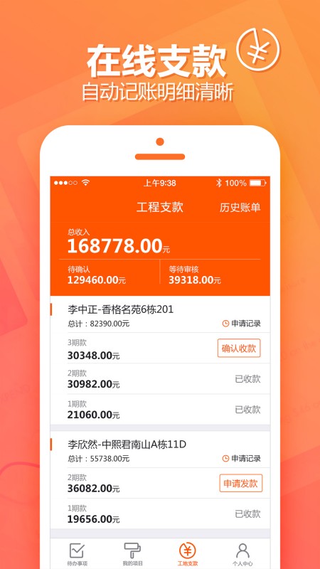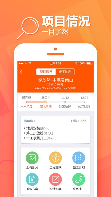 1、 可视化移动装修管家,实现随时随地查看工地进展,为您节省时间。