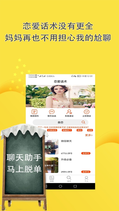 恋爱话术聊天回复是一款拥有海量免费情感知识的干货分享平台,教你如何与心仪的Ta聊天。让聊天变得有趣,让你的形象变得更幽默! 应用功能