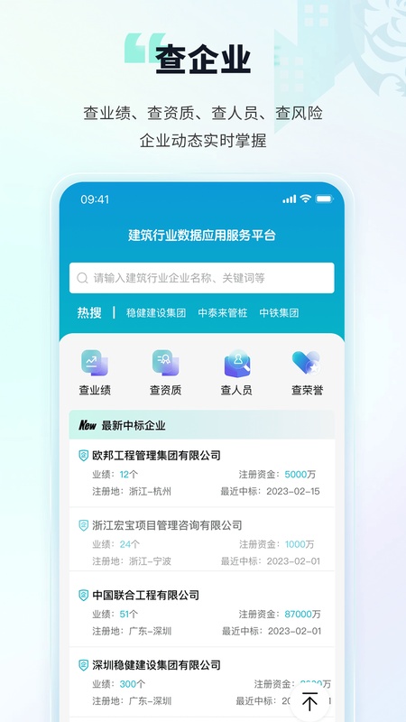 查企业:一键查询建筑企业多维数据,企业动态实时掌握;包括中标业绩、建造师在建、经营信息、荣誉、资质、备案、人员、工商信息、经营风险、司法风险等;