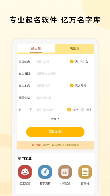超流行的宝宝起名字测名专业软件,为您提供取起名字,测名字,大师人工起名等服务,免费获取上亿精选的男孩名字和女孩名字,每一个名字都是起名专家精心手工精选,确保每个名字都是精品好名字。
