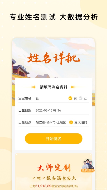 若需要专业起名大师一对一起名服务,软件会进行专业大师层层信息筛选,为用户提供1对1私人定制起名,起名过程全程跟踪,若不满意可免费重起。