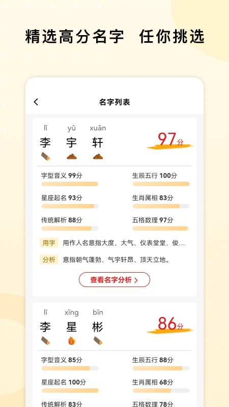 结合中国传统楚辞诗经、唐诗宋词、易学五行、论语、生肖属性、中华百家姓等各类传统国学文化,为宝宝提供有文化底蕴的国学好名字。具备专业免费起名功能,一键获取90 - 100分以上名字,有上百个好名字供随意挑选。还能科学智能测名字,通过独家名字打分系统,基于全网亿万姓名大数据分析姓名,全面解析名字的使用频率、流行度趋势等,多维度展示名字的各类解析。