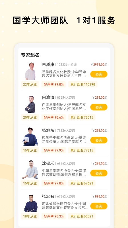 专业大师层层信息筛选,1对1私人定制起名,个性化定制起名,白渝亲,朱质康等国学大师权威专家,著名易学文化起名教授,中华杰出起名策划师,国学顾问,热衷于探索、研究和应用国学文化,二十年前专注起名,改名,一对一起名,全程跟踪服务,不满意免费重起,满意为止,无后顾之忧。