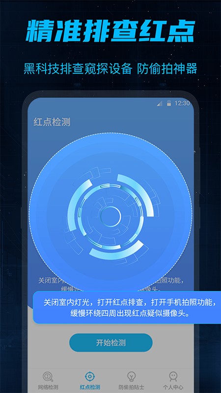 能帮助用户保护隐私安全,针对生活中多种场景可能存在的隐蔽摄像头进行检测,如旅游住酒店、民宿、客栈,生活中租房、合租、拼宿舍,购物时的洗手间、更衣室、化妆间等。