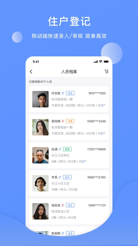提供住户登记功能,方便物业对小区内的人员信息进行管理和统计,确保社区人员信息的准确性和安全性。