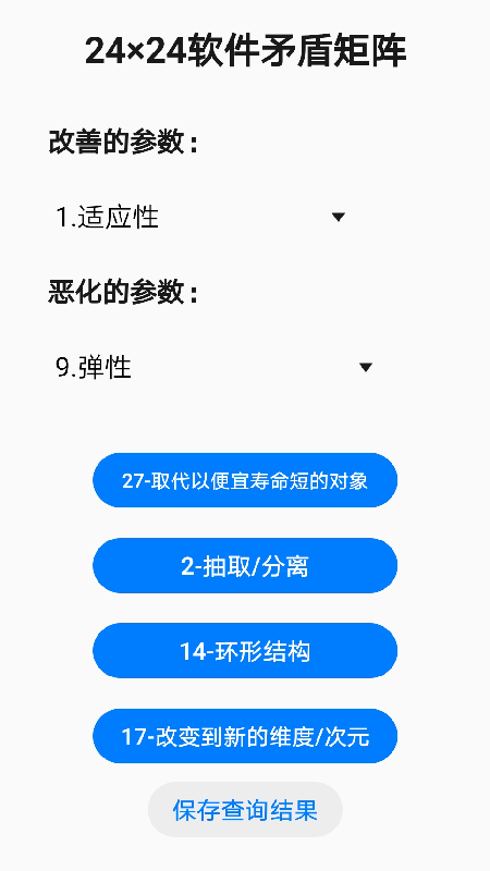 TRIZ爱好者在遇到发明问题时,可以利用本应用提供的39*39矛盾矩阵、24*24软件矛盾矩阵等工具进行问题分析,通过矩阵找到对应的矛盾关系。再结合40发明原则,从中获取解决问题的思路和方法,进而运用这些思路和方法去解决实际的发明问题。