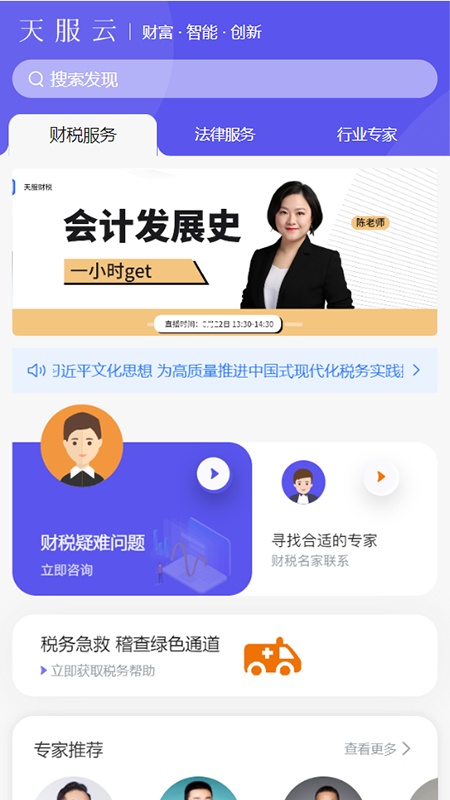 天服云是专业解决企业涉税问题的财税服务软件,平台聚集全国顶尖财税专家,提供1对1常年财税顾问服务,财税健康体检,一带一路税务指导,财税新闻及政策解读等多项财税服务。 功能特色