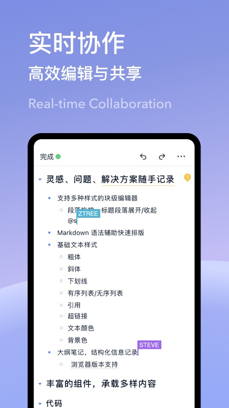 • 多人协同创作,团队成员协同编辑,内容更新及时提醒 。