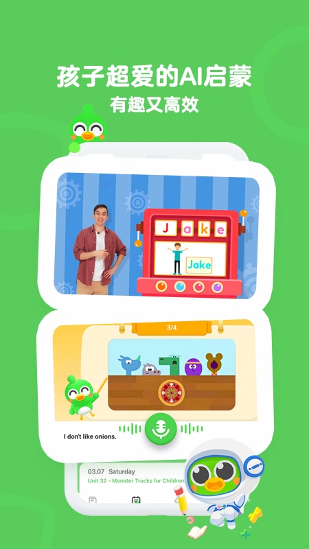 采用习得与学得双结合的理念,以原版动画视频进行沉浸式学习,能为孩子创造纯正的家庭语言环境。所选动画符合孩子认知水平,容易激发孩子兴趣,让孩子愿意反复学习,从而自然习得第二母语。