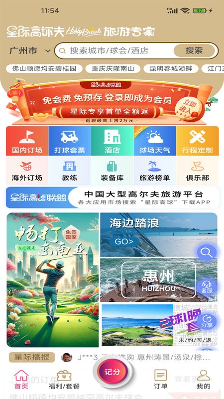 中国大型高尔夫预订平台,球场天气,球道图,球场交通,球场附近酒店,球场附近特色美食,高尔夫计分等各项功能;