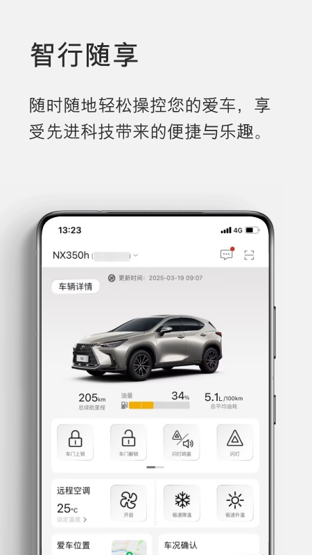 对于搭载完整版 LEXUS G-BOOK智能副驾/LEXUS Connect智行互联服务的车型,可查看车辆油耗、行驶里程、状态,并可远程设置车辆电子功能、车辆门锁和危险告警灯。对于电动车型,还可远程操作空调、远程充电、充电桩检索。