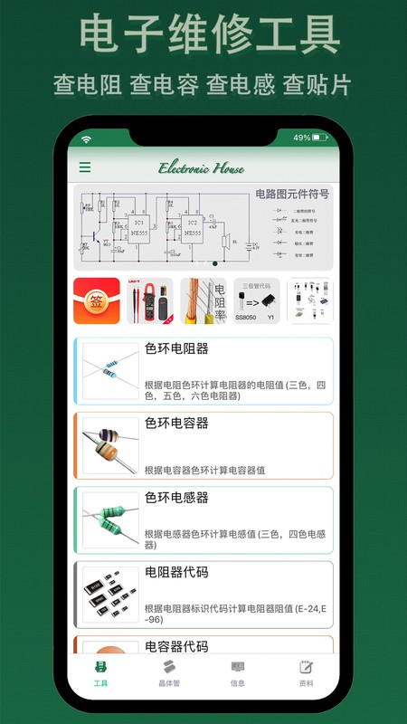 电子家是一款简单易用的电器电子元件信息查询的APP,主要功能包含色码电阻计算,色码电感计算,IC集成电路引脚,电子元件资讯,电路介绍,电子元件基础,LED电阻计算,串联并联电阻计算,串联并联电容计算,本软件所有电子/电路等相关信息均来源于作者日常学习和工作的积累和网络的搜集。如果本软件侵犯到您的权益或名誉请及时联系我们,我们会第一时间处理并及时公布处理结果。本软件目的是为了帮助各类对电子元件信息有查询需求电子爱好者/维修人员/学生/科研人员等提供一个便捷平台,充分利用现代网络技术快速查询了解电器电子元件信息/电子电路信息提供便利。 软件特点