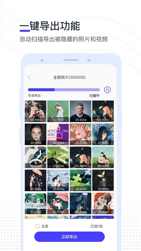 视频照片恢复大师可对手机中的照片、图片、视频进行深度扫描,将扫描到的图片照片恢复导出到相册及文件管理中。支持导出手机相册照片、微信图片、QQ图片、微信朋友圈照片以及其他照片等。还能对单个 app 如微信、QQ 的图片、视频、缓存数据进行深度扫描,并恢复成相册照片导出到本地。