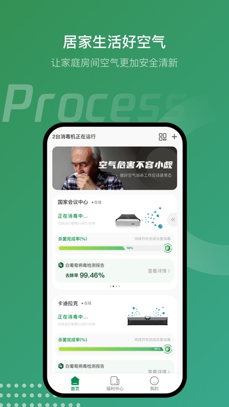 空气卫士app可通过蓝牙绑定家居消毒机设备,并帮助设备完成无线Wi-Fi连接,从而接收设备检测到的空气质量数据以及开、关机状态。