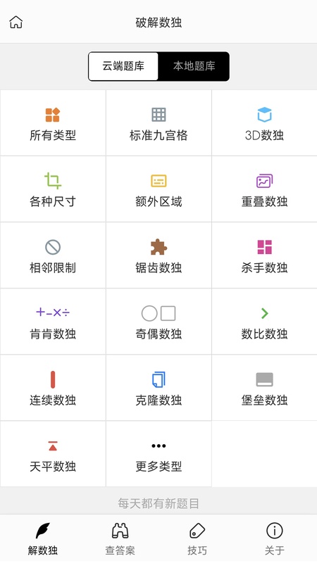 各类数独的题目/答案/逐步讲解,可拍照录入。支持四宫、六宫、八宫、九宫、十二宫、十六宫、锯齿数独、杀手数独、肯肯数独、武士数独、鲜花数独、风车数独、合体数独、蝴蝶数独、十字数独、双叠数独、三叠数独、僧兵数独、奇偶数独、数比数独、克隆数独、堡垒数独、连续数独、不连续数独、无缘数独、无马数独、3D数独、天平数独、对角线数独、百分比数独、窗口数独、星形数独、烛台数独、中心数独、金字塔数独、同位数独等。