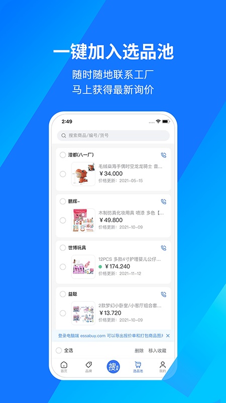 宜采选品汇集海量源头工厂和商品SKU,为贸易商提供数字化服务。有发布找样功能,在线一键发布找样需求,能获3W工厂精准回复;查找商品汇聚30000 + 来自澄海义乌工厂的100W + 商品,支持关键字搜索和一键上传图片极速识图搜索;新品推荐每日上线1000 + 新品,涵盖玩具、婴儿用品等各类商品;小视频可随手刷,多角度了解商品;工厂圈有来自工厂的精品推荐;选品池可将商品加入,自动向工厂询新价格并获取工厂联系方式。