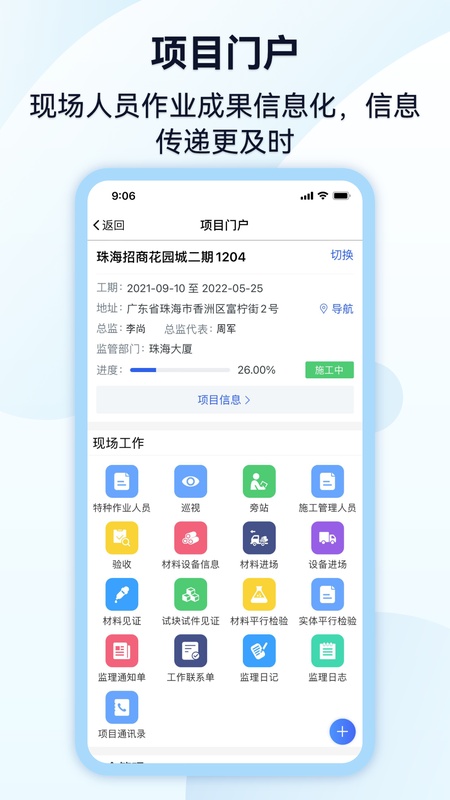 监理通融合了数百家工程咨询企业信息化的实践经验和管理智慧。以“顾问式引导、产品化支撑、助力企业管理提升”为服务理念,为工程咨询企业搭建“业务规范”、“信息共享”、“高效协同”、“安全可靠”的管控体系,实现综合办公、人力资源、市场经营、分公司管理、工程监理、造价咨询、招标代理、财务管理、知识管理、管理门户等应用。监理通基于智能开发平台,通过“标准产品 + 定制开发 + 快速实施”服务方式,满足客户个性化服务的要求,提升企业信息化应用价值。适用:工程监理、项目管理、造价咨询、招标代理、工程检测等各类工程咨询企业。 APP功能