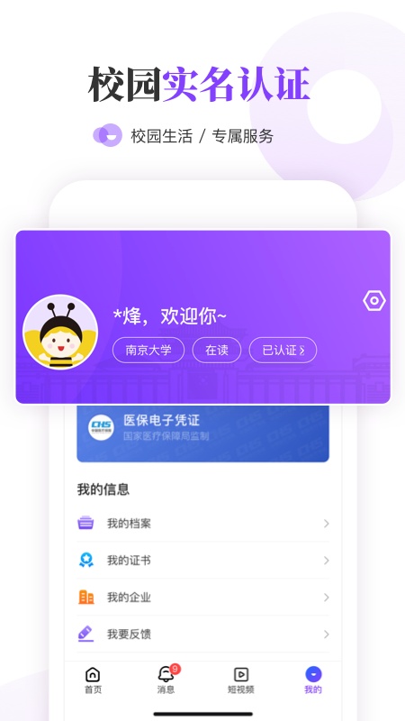 南京大学生版APP面向大学生群体,针对其报考、学习、生活、实习、就业等需求特点进行设计。运用微服务、千人千面等新技术,构建了全新的APP框架,能够为不同的大学生用户提供个性化的体验。