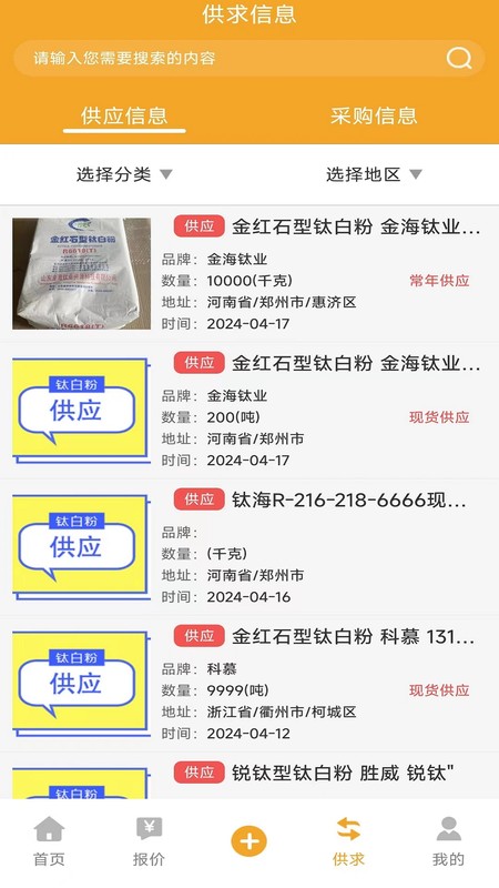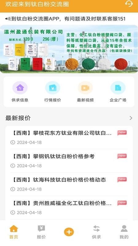 咱钛白粉行业自己的APP!是钛白粉采购和销售的垂直行业信息平台,里面包含各种钛白粉、黑色母、塑胶原料等,在这里找供求,做生意,一应俱全,快来进入吧! 软件功能
