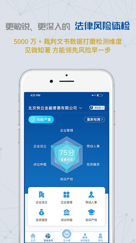 不同于传统的法律服务形式以及简单的在线法律服务,云律通智慧企业法务管家在互联网空间打造线上线下联动的企业法律服务和管理系统,将风险体检、智能服务、律师服务、大数据案例分析、法务档案管理、法务资讯看板、多种实用法律工具和全程客服支持集成一体,使企业从初创设立、运营管理到融资壮大的每一阶段,均可轻松获得法律专业团队的鼎力支持。 云律通智慧企业法务管家软件功能