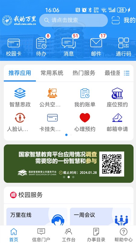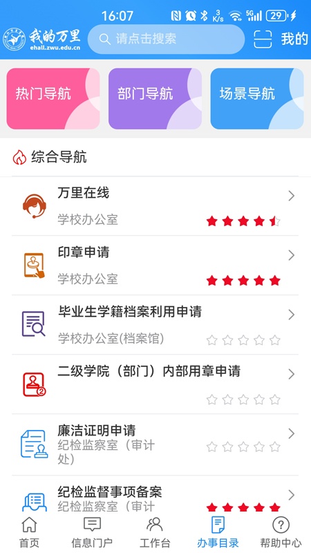浙江万里学院最多跑一次校务服务网APP统一平台(简称“我的万里APP”),梳理学校面向学生、教师、校友的所有办事服务。通过一站式办理、事务化协同、多终端结合,让师生办事最多跑一次,充分展现学校“巧融合、精管理、智服务”的理念。