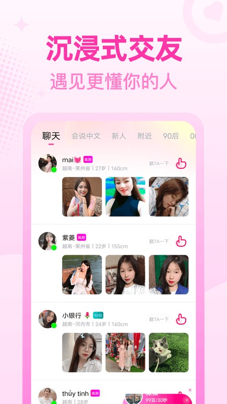 主打中越跨国交友,能带来沉浸式社交体验。用户可以足不出户,通过该应用从河内早市到西贡夜景感受越南的烟火气。