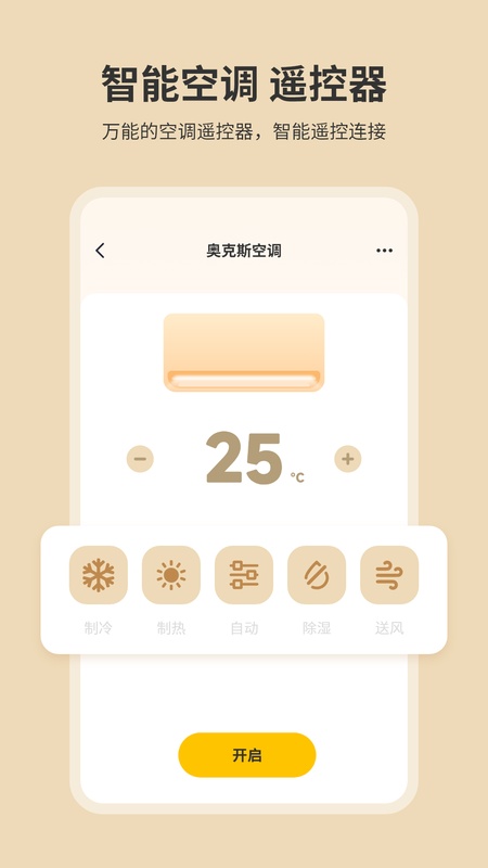 手机开空调是一个简单、易用、专致于安卓手机智能家居家电遥控器,体积小,功能强。较小安装包,不占用手机空间,每当你找不到你的遥控器,万能遥控器就会帮助你,可以控制网络功能的电视以及空调、机顶盒、电风扇扫地机器人等家电设备,家电遥控器:电视机/机顶盒、盒子、空调、电风扇、DVD、功放、投影仪等都能遥控若您的手机不具备红外功能,则该遥控器APP需要匹配外部设备才可以正常使用。开空调、开关遥控器、开电视、手机开空调 软件功能