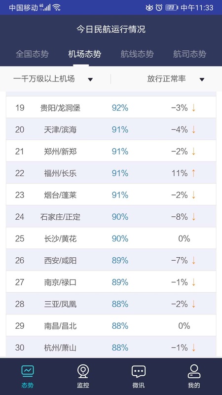 民航运行态势监控是实时掌握全国民航航班运行情况的移动应用。主要功能包含全国、机场、航线和航司的运行态势分析,展示航班空中航迹和告警信息,以及微讯、个人中心等辅助功能。 APP功能