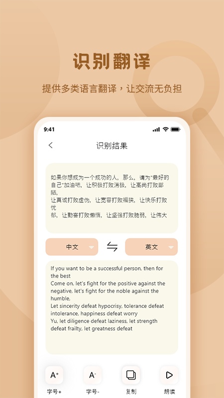 1,拍图识字:拍摄要识别的图片,便可一键提取图片中的文字,您可以根据需求放大文字,便于阅读,还可以朗读和实时翻译,简单好用。