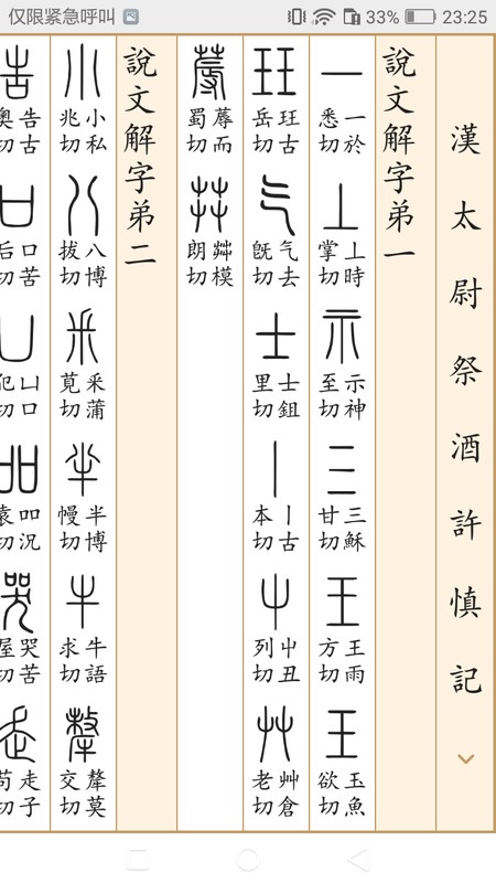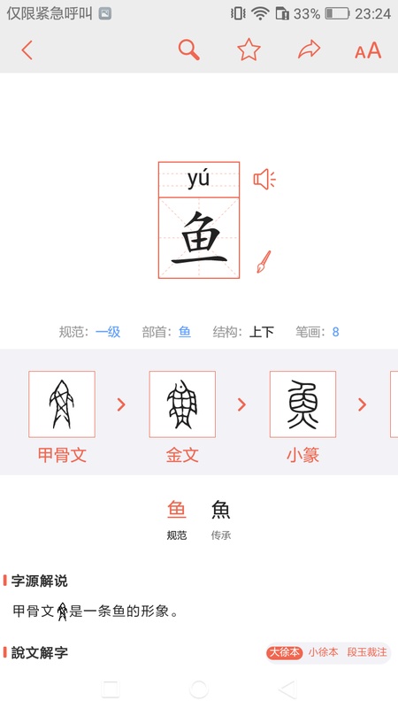 该应用具备丰富的功能。它内置字典查询功能,已收录两万多汉字及其释义。编辑精选了两千多汉字的字源解说及其甲骨文、金文、小篆、秦代隶书等各时期的字形,还有九千多个小篆字形及《说文解字》(大徐本)、《说文解字系传》(小徐本)、《说文解字注》。提供百家姓、千字文、小学生1 - 6年级字表、天文、地理等20个字表方便分类查阅。此外,还有精选每日一字功能,可让用户日积月累掌握汉字;展示各时期汉字字形演变,呈现数千年沧桑;有精美的字形演变卡片可轻松分享到微信朋友圈;对字形进行讲解,告知汉字背后的故事;提供现代汉字释义,帮助用户掌握汉字现今用法;支持用户添加喜欢的字到收藏以便随时查阅;不断更新传统文化知识,助用户找到文化习惯的历史源头。