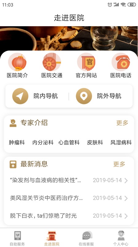【就医指南】有门诊指南,包括挂号、付费时间等,还提供住院手续流程。