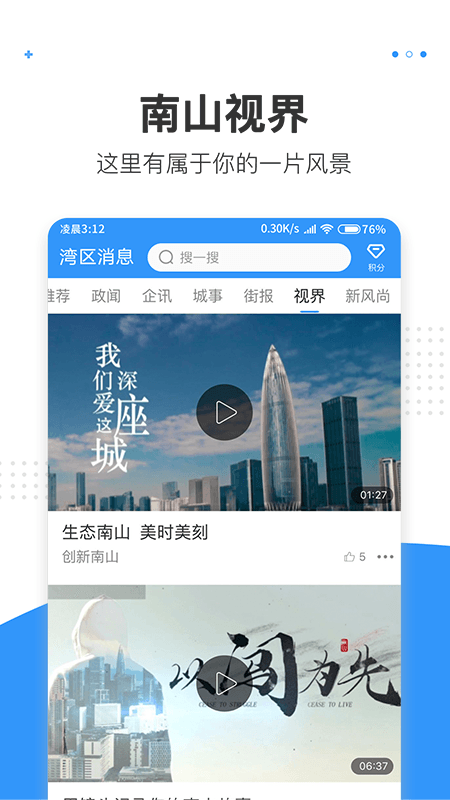 资讯随享、湾区共融。“湾区消息”是深圳市南山区整合“融媒体中心”、“新时代文明实践中心”、“文体通”三大平台而建设的移动客户端。集合最贴近市民、贴近生活、贴近企业的新闻资讯、百姓故事、企业快讯、街区风采、生活指南,提供最便捷的公共文化服务,集成新时代文明志愿者活动信息及参与入口,凝聚群众、传递风尚、实践文明。悠然生活,尽在“湾区消息” 软件功能