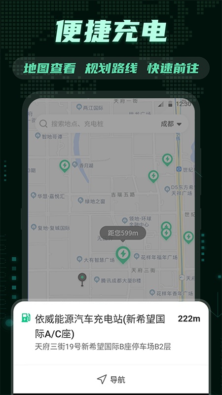 一键导航:一键找到最方便、服务更优的充电站并导航到目的地。