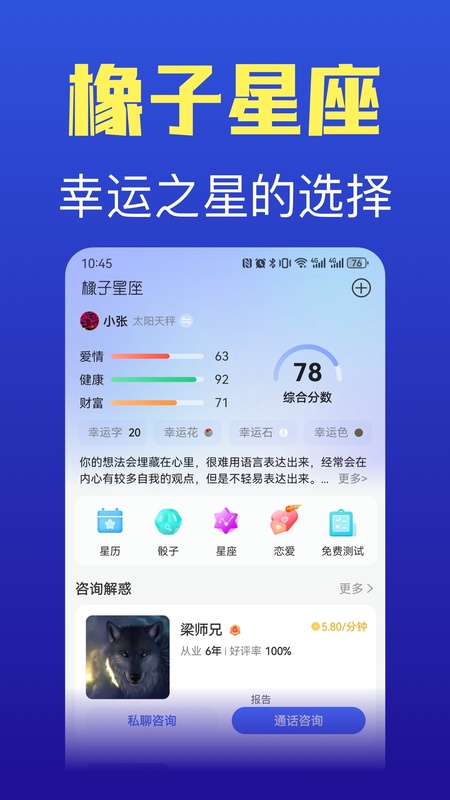 橡子星座每日有百万星座爱好者在线沟通,为用户提供了丰富多样的星座相关功能。它汇集上万星座方面心理咨询师,可实时进行在线语音一对一专业服务。同时提供多种专业星座工具,助力用户更好地认知自我,快乐自信生活。