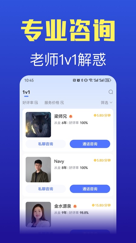 上万专业心理咨询师24小时一对一语音通话服务;实时分析解答用户的情感问题,帮您快速的决断心中疑惑,给出专业建议。