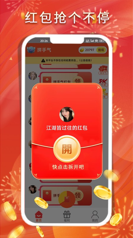 拼手气模式专区采用红包接龙,手气最佳者继续发红包,20人平分手气金豆,充满趣味性和互动性。