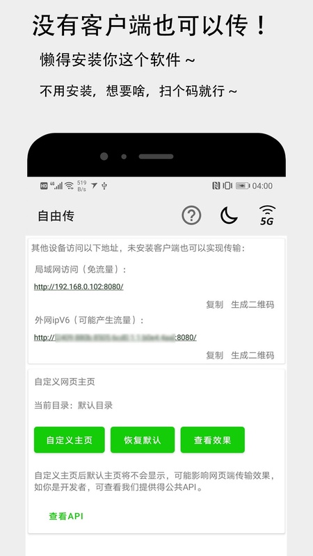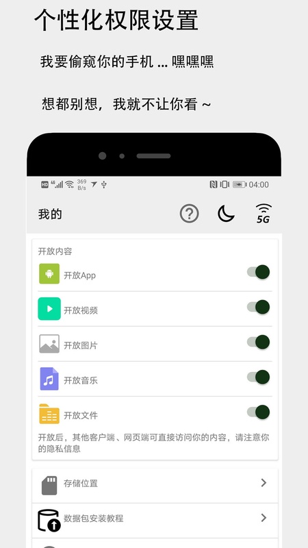 【跨平台】:使用本程序将在手机上创建一个站点,其他手机,电脑在同一局域网内可通过浏览器与程序进行连接,浏览器页面同样支持视频直播,音乐直播,文件传输等。 App功能