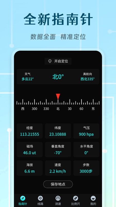 北极指南针是一款专业的指南针定位工具,可利用网络、GPS、手机传感器等数据确定所在地的天气、经纬度、海拔等信息。支持实时显示GPS信息、GPS测速以及海拔高度、天气、气压、风向等实用信息。其具体功能包括:在指南针功能方面,能显示坐标、方向,可快速找到东南西北及精确到小数点后4位的经纬度;显示当前地理位置具体到楼、县、街道;显示纬度、经度、气压、海拔、速度;显示当前位置磁场强度;显示实时天气情况,如温度、阴晴天、风速级别、风向;支持磁场校准功能;支持屏幕锁定以方便记录数据;提供多种精美指南针罗盘样式。在精准度校准上,可在8字形运动中正确挥动设备几次,若问题仍未解决,可沿着3轴旋转设备多次。