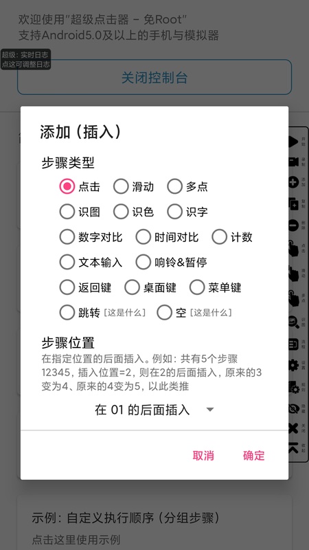 超级点击器功能丰富,可帮用户彻底解放双手,实现屏幕自动点击。支持点击、识图点击、识别颜色、识别文字、数字对比、文本输入、时间对比、计数、响铃&暂停、规则多开、步骤流程图、重新排序步骤、批量修改、实时日志、图片识别、疯狂点击、区域点击、多图识别、多色识别、多字识别、多数字对比、多点同时点击或滑动、北京时间定时、定时开始、随机步骤、随机时间、复制步骤、插入或移除指定步骤、任意循环步骤、保存与加载规则等功能。后续版本还会陆续完善与添加新功能。