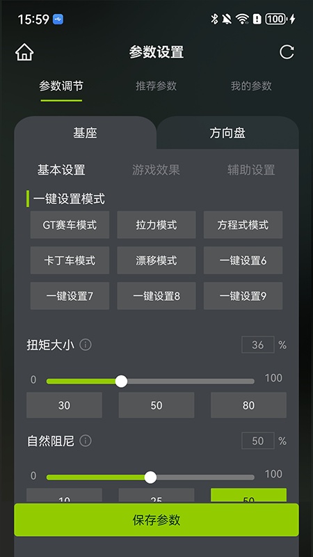,连接后可以调试赛车模拟器的各种参数,如设置转向角度等,还能保存设置的参数,再次进入应用后,设备可以快速写入已保存的参数配置 功能特色