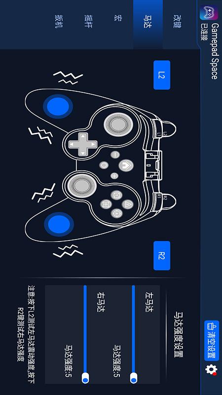Gamepad Space是一款经过私有协议连接后可以自定义蓝牙手柄按键映射、按键连击、马达属性、按键宏、扳机按键死区、摇杆死区和摇杆映射等功能设置的的工具APP。通过修改自定义按键映射、按键连击、马达属性、按键宏、扳机按键死区、摇杆死区和摇杆映射等,使得键位适合玩家自己的操作习惯或匹配玩家想玩的游戏。 软件特点