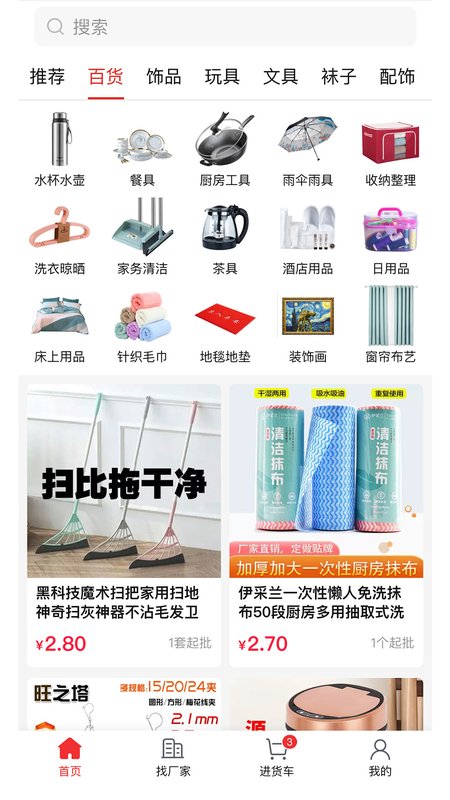 万货批发app汇集义乌、临沂、广州等一手厂家货源,提供日用百货、五金工具、饰品头饰等特价产品。支持一件起批,用零售数量享受批发价,且一件起批运费极低。还为各地亚马逊、阿里巴巴1688直播等众多电商平台卖家及线下创业者、地摊夜市从业者、网红直播带货者等提供一件代发服务。商品品类齐全,覆盖工艺饰品、节庆用品、儿童玩具等全行业小商品。同时有热门货源基地,包含饰品头饰、新奇玩具、日用百货等多种批发类别。