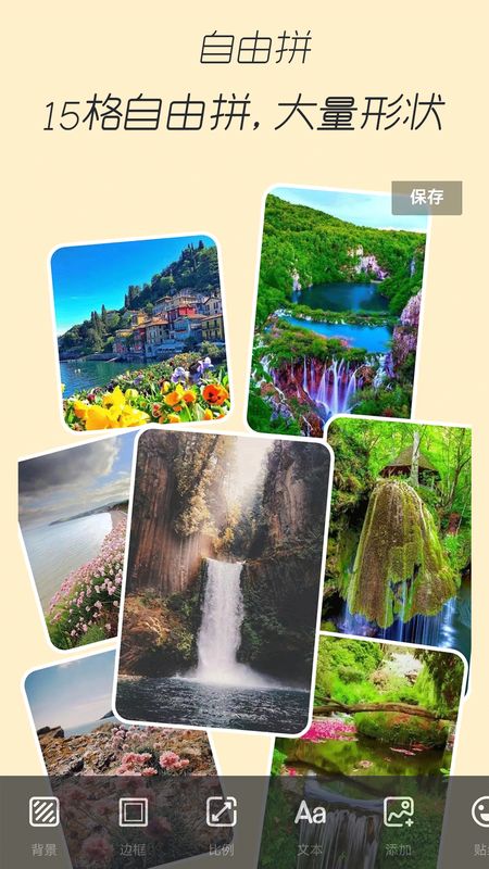 2、多达15张的自由拼图:随意改变拼图效果,支持每张图片裁剪、抠图、滤镜、翻转等效果