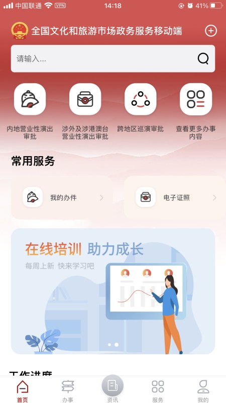 涵盖政策资讯发布、行政审批办理、在线培训学习、电子证照应用等服务事项。